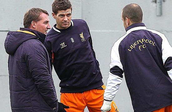 TOP KOP ... Brendan Rodgers with Steven Gerrard and Joe Cole (right) in training yesterday