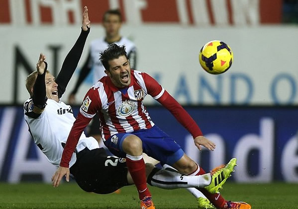 Painful: David Villa goes down under challenge of Valencia's Jeremy Mathieu