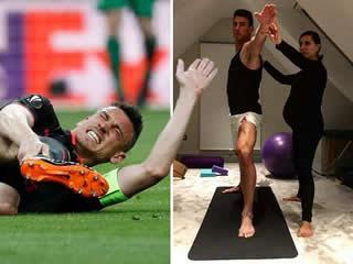 Arsenal star Laurent Koscielny practices his yoga as part of rehab from ruptured Achilles