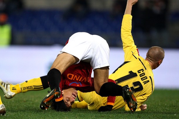 ROME - FEBRUARY 04: Nicolas Burdisso (L) of AS Roma takes a tumble during the Tim Cup match between AS Roma and Udinese Calcio at Olimpico Stadium on February 4, 2010 in Rome, Italy.