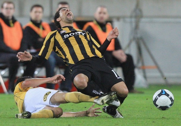 WELLINGTON, NEW ZEALAND - FEBRUARY 12: Daniel of the Phoenix is tackled by Andrew Clark of the Mariners during the round 27 A-League match between the Wellington Phoenix and the Central Coast Mariners at Westpac Stadium on February 12, 2010 in Wellington, New Zealand.
