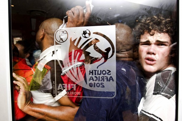 South African student Gordon Bolson is pressed against a glass door at a 2010 FIFA World Cup ticket sales office in Brooklyn Mall on April 15, 2010 in Pretoria, South Africa. Some fans queued overnight and police were called in following outbreaks of disorder at ticket offices around the country where 2010 FIFA World Cup tickets were made available to purchase with cash for the first time as a result of lower than expected demand.