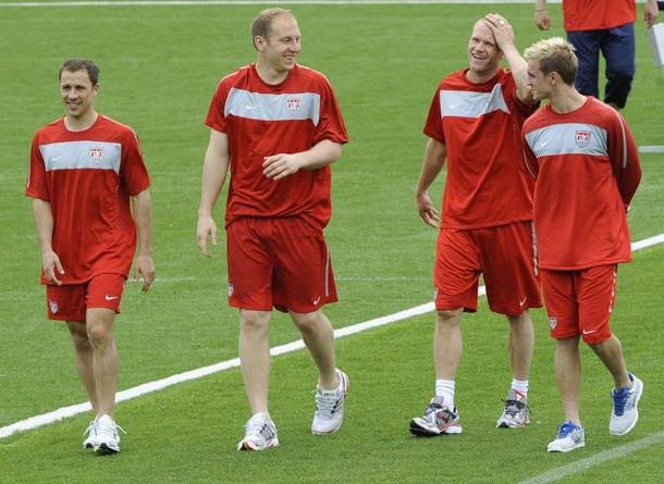 (L-R) Team USA's Steve Cherundolo, Brad Guzan, Jay DeMerit and Stuart Holden leave the field after a training session in Princeton, New Jersey, May 17, 2010, as they opened a training camp for the upcoming FIFA World Cup. The USA will play England on June 12, 2010, in their opening match of the FIFA Word Cup in South Africa.