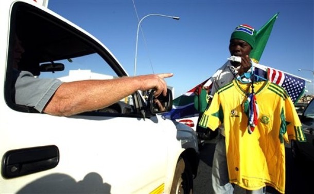 Gavin Shilowa, a street trader sells soccer World Cup merchandise to motorists, in Johannesburg, South Africa, Friday, May 14, 2010. The Soccer World Cup kicks off in South Africa in less than a month.
