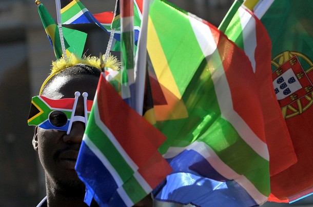 A street vendor wearing the South African flag sun glasses sells flags in Johannesburg on May 14, 2010 of the 32 countries taking part in the FIFA World Cup hosted by South Africa from 11 June to 11 July.