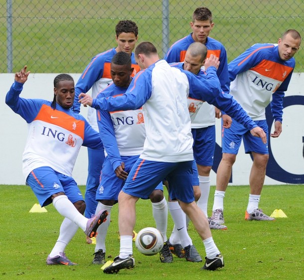 Players play with a ball during the first Netherland's team's practice on the opening of their training camp in the Tyrolian village of Seefeld in Austria on 20 May 2010 in preparation for the 2010 FIFA World cup hosted by South Africa from June 11 to July 11.