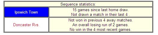 Ipswich Town are hovering perilously just above the relegation zone, with 28 points from 25 matches. Doncaster Rvs. see themselves just below half way in the Npower Championship, showing a record of 34 points from their 24 games played so far.