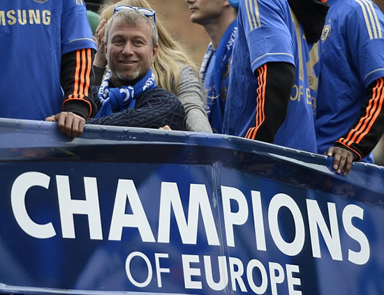 The Holy Grail: Chelsea owner Roman Abramovich celebrates on the team bus after winning the trophy he wanted more than most