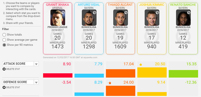 Thiago and Kimmich offer a lot going forward whilst Xhaka has slightly done more than Vidal in their respective leagues.