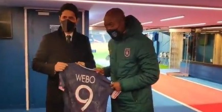 PSG president Nasser Al-Khelaifi gives Pierre Webo a No9 shirt after the Istanbul coach was the subject of an allegedly racist comment in the original tie