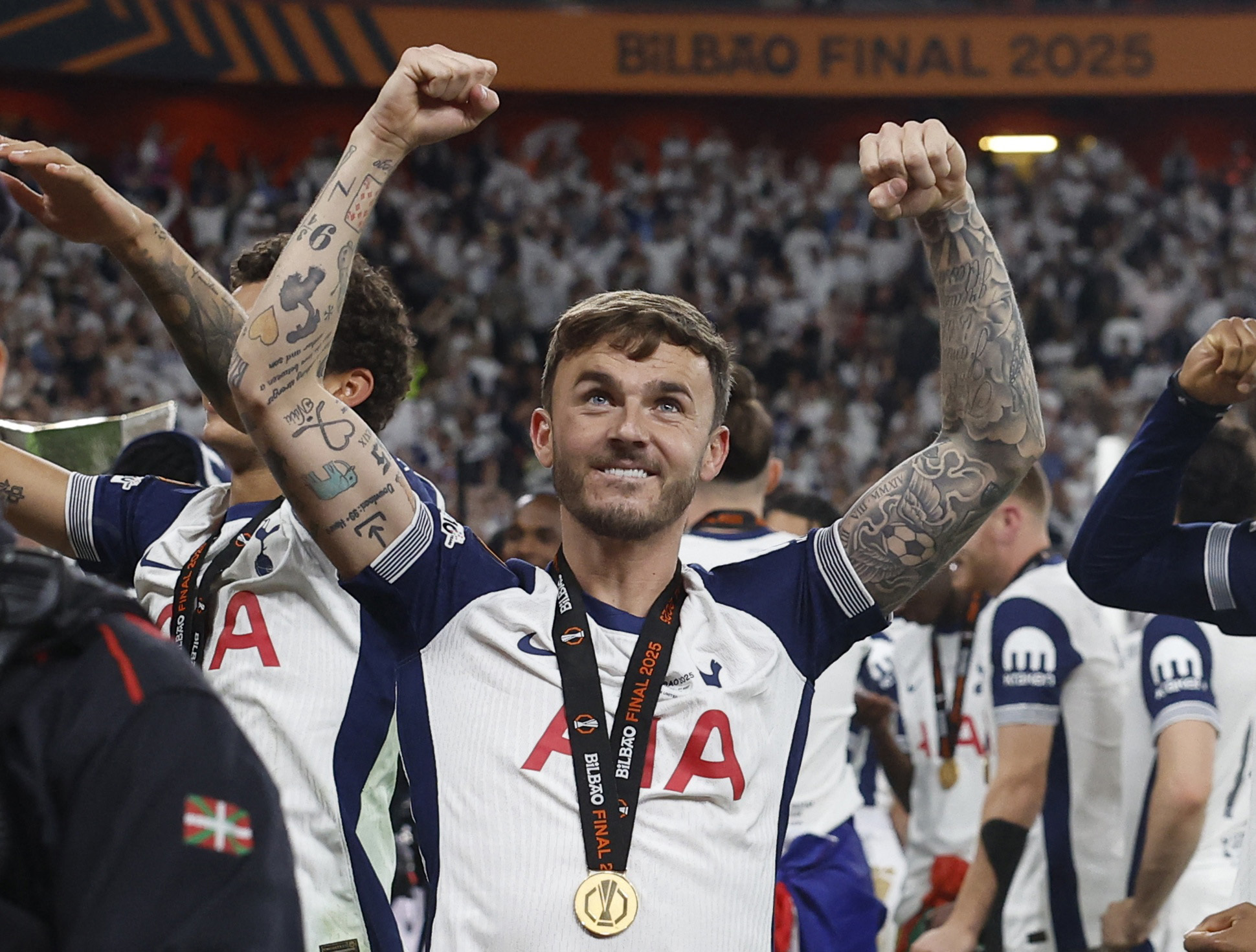 But Maddison somehow found the time for a quick change as he reappeared for Spurs' trophy lift in his full kit.