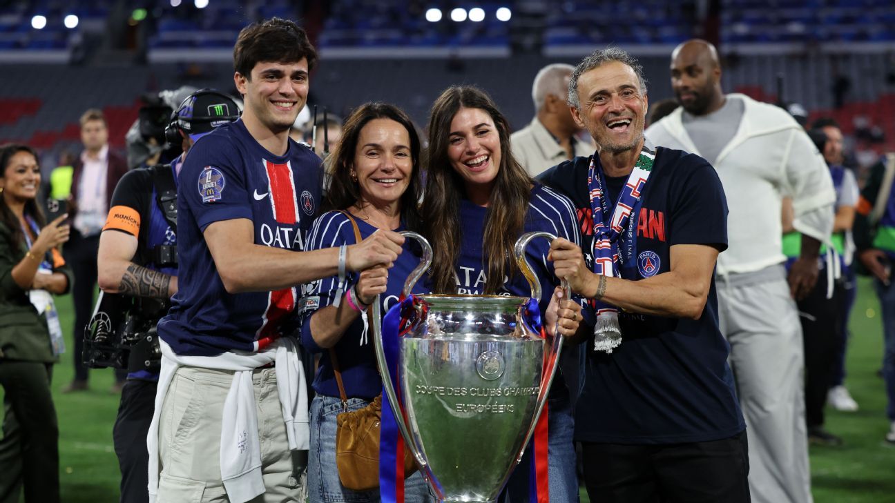 Luis Enrique (right) celebrates PSG's Champions League victory with his wife, Elena Cullell (second from left), and his children. Photo by Christian Charisius/picture alliance via Getty Images