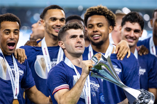 Christian Pulisic celebrates with teammates after beating Mexico to win the Concacaf Nations League final