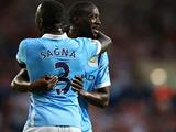 Manchester City's Yaya Toure celebrates with Bacary Sagna after scoring his side's second goal against West Bromwich Albion.