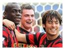 GOOD GUY ... Mario Balotelli celebrates with Adam Johnson and David Silva